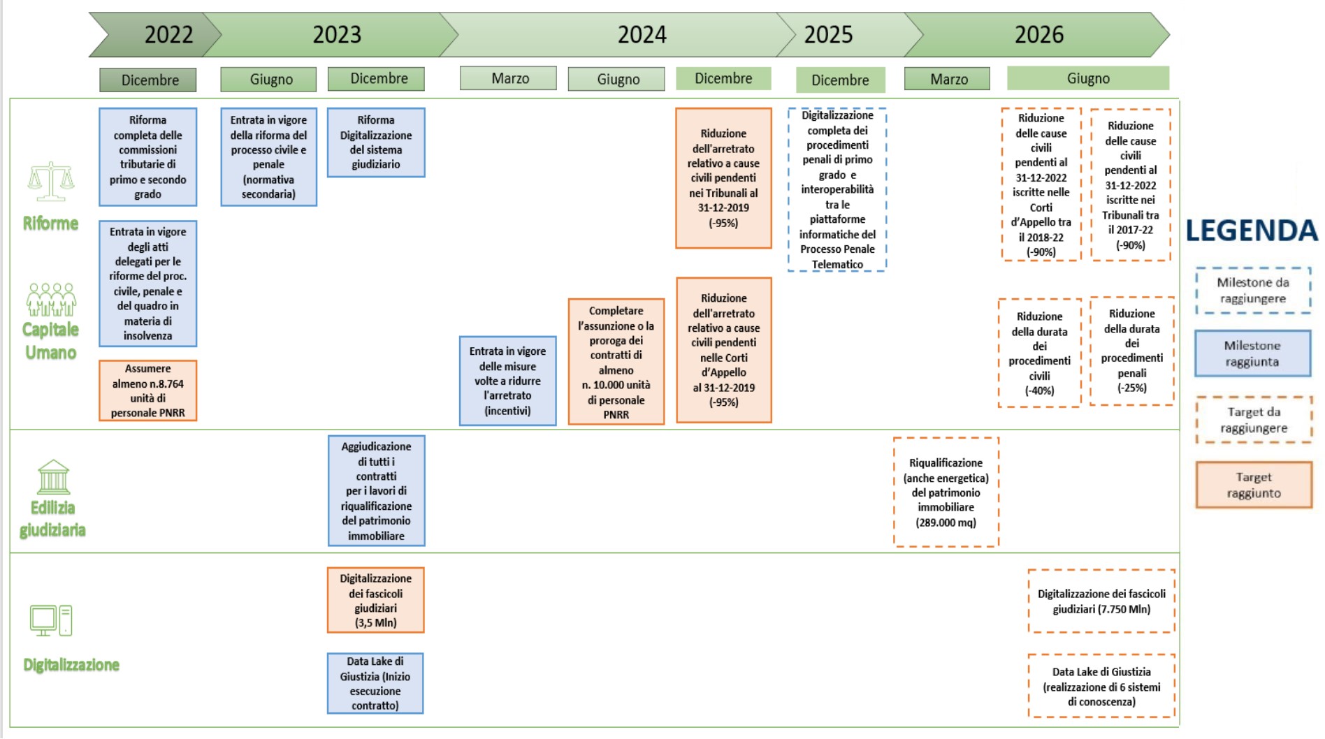 L'attuazione di ogni intervento è caratterizzata dal raggiungimento di traguardi qualitativi 'Milestone' e di obiettivi quantitativi 'Target', da completare entro giugno 2026.