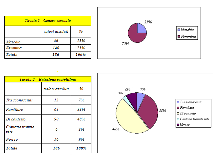 E’ significativo che solo nell’11% dei casi il reato è consumato tra sconosciuti; ne consegue che l’autore godeva di un rapporto di fiducia con la vittima.