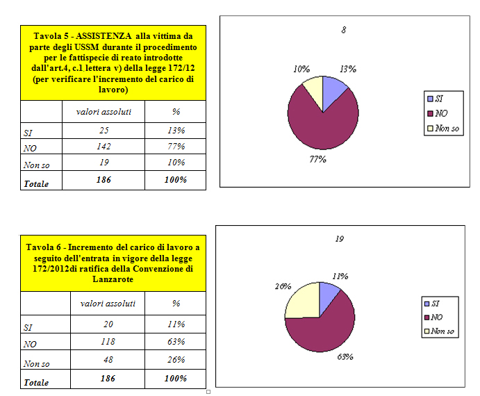 Per quanto riguarda i dati relativi all’incremento del carico di lavoro a seguito dell’entrata in vigore della legge 172/2012, appare prematuro esprimere delle ipotesi valutative al riguardo stante il breve lasso temporale trascorso dall’entrata in vigore della legge di ratifica della Convenzione di Lanzarote ( tavole n.ri 5 e 6 e relativi grafici).