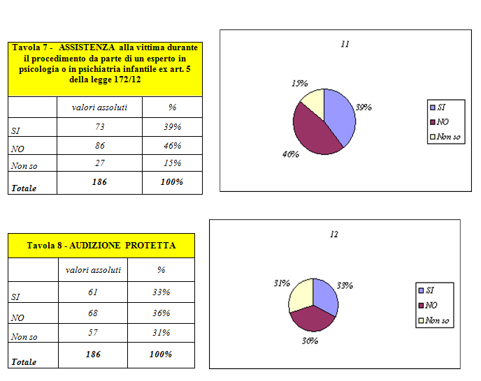 Anche per quanto riguarda l’audizione protetta, si registra una forte percentuale di casi (36%) in cui non viene adottata tale modalità di ascolto del minore ed una percentuale altrettanto alta di “non so”, pari al 31%, dimostrando come nella prassi si dovranno maggiormente accogliere nell’ambito operativo i principi di una compiuta protezione del minore evidenziata anche dalla Convenzione di Lanzarote (Tavola 8).