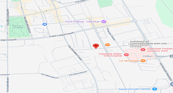 - deve essere ubicato nella città di Bari e, in caso di immobile di ridotte dimensioni, nelle immediate vicinanze dell’attuale sede di via Demetrio Marini, 3 e precisamente in un quadrilatero compreso tra le vie: V. Conte Giusso, Via Amendola fino all’intersezione con Via Omodeo, Via Omodeo fino all’intersezione con Via della Costituente, Via della Costituente, Via Falcone e Borsellino fino all’intersezione con Via Alberotanza, Via Fanelli fino all’intersezione con Via Conte Giusso, come da mappa che segue: